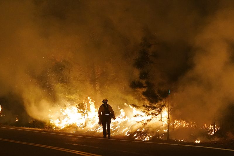 | A firefighter walks along state Highway 168 with a drip torch during a controlled burn to fight the Creek Fire |